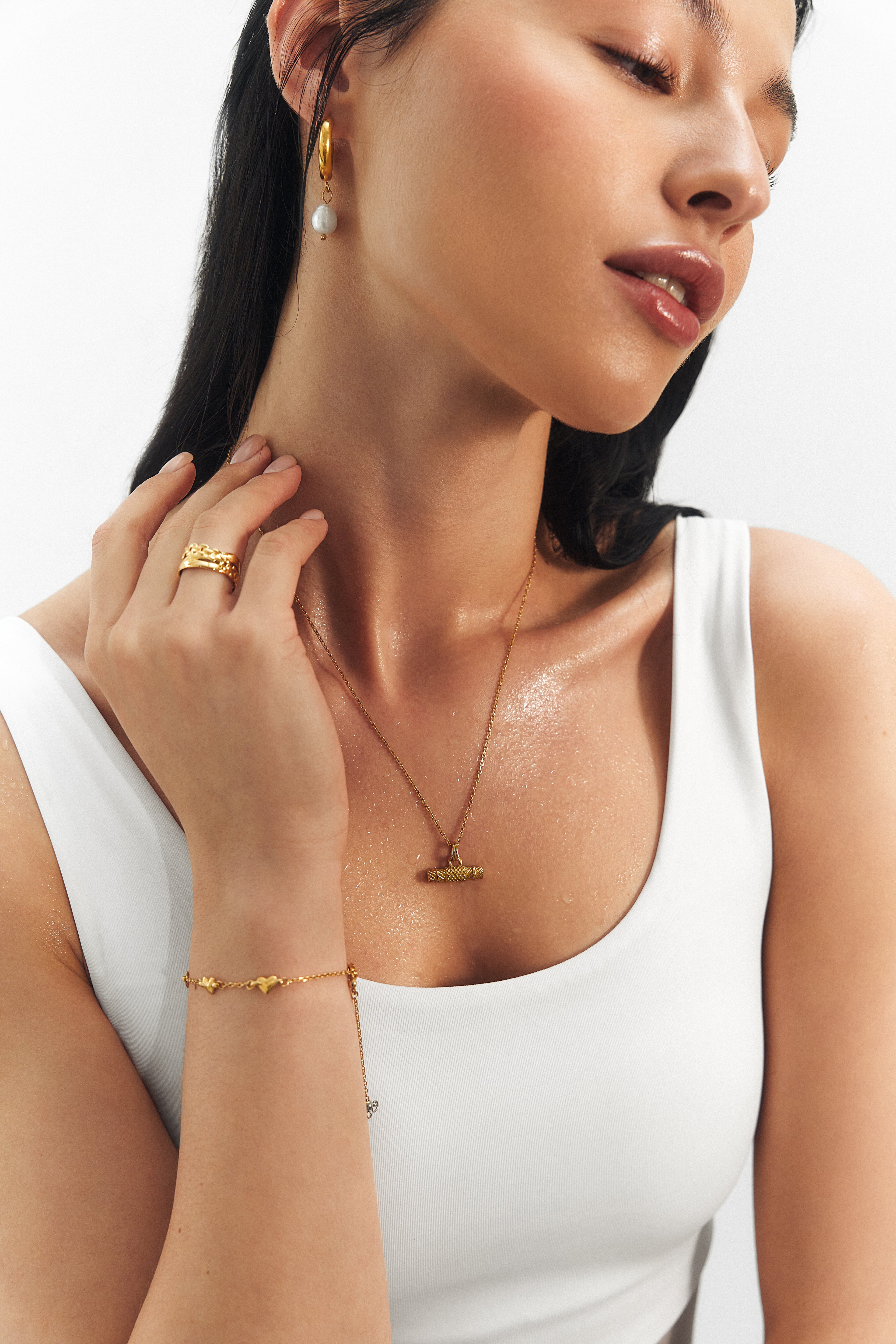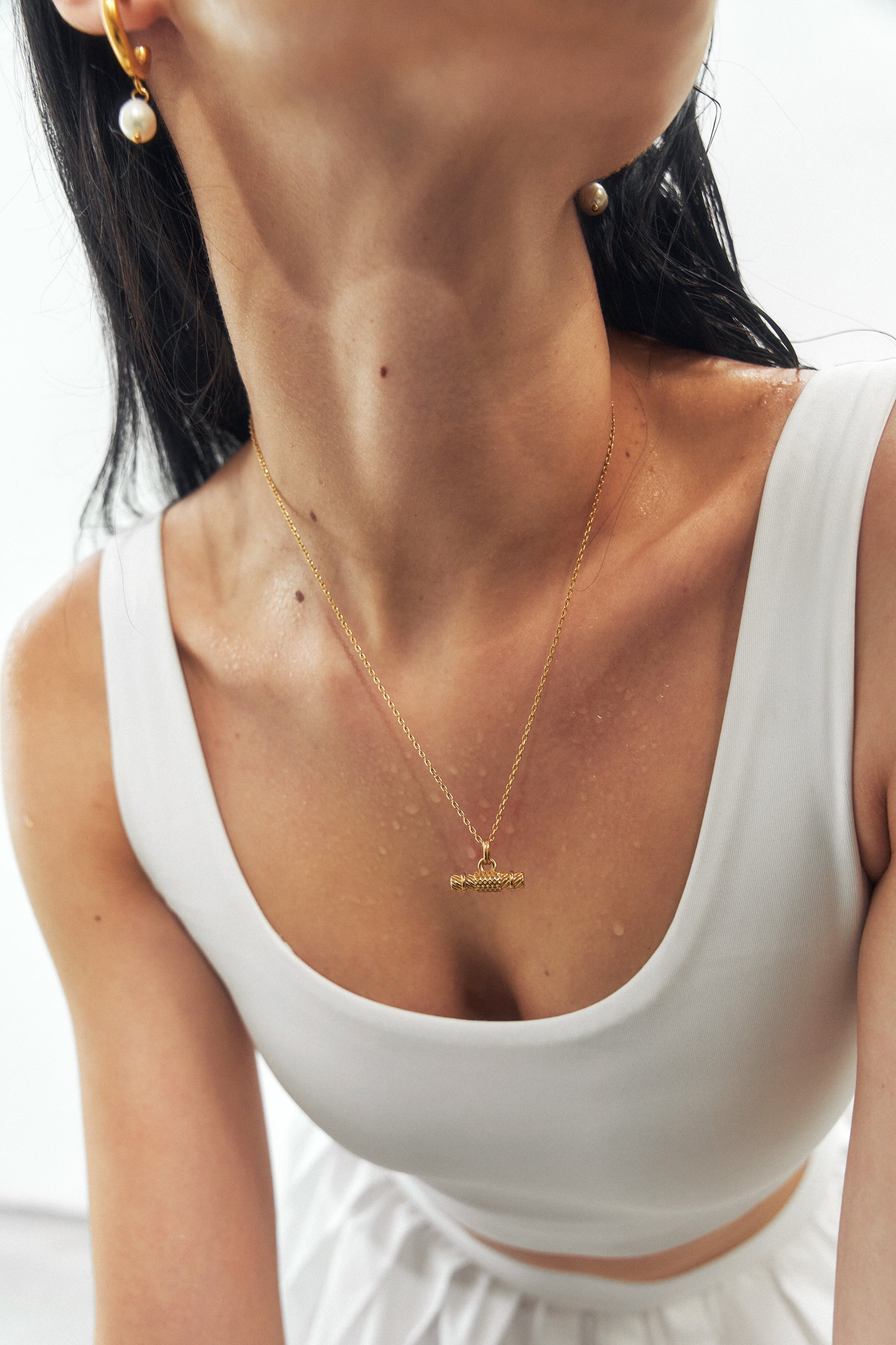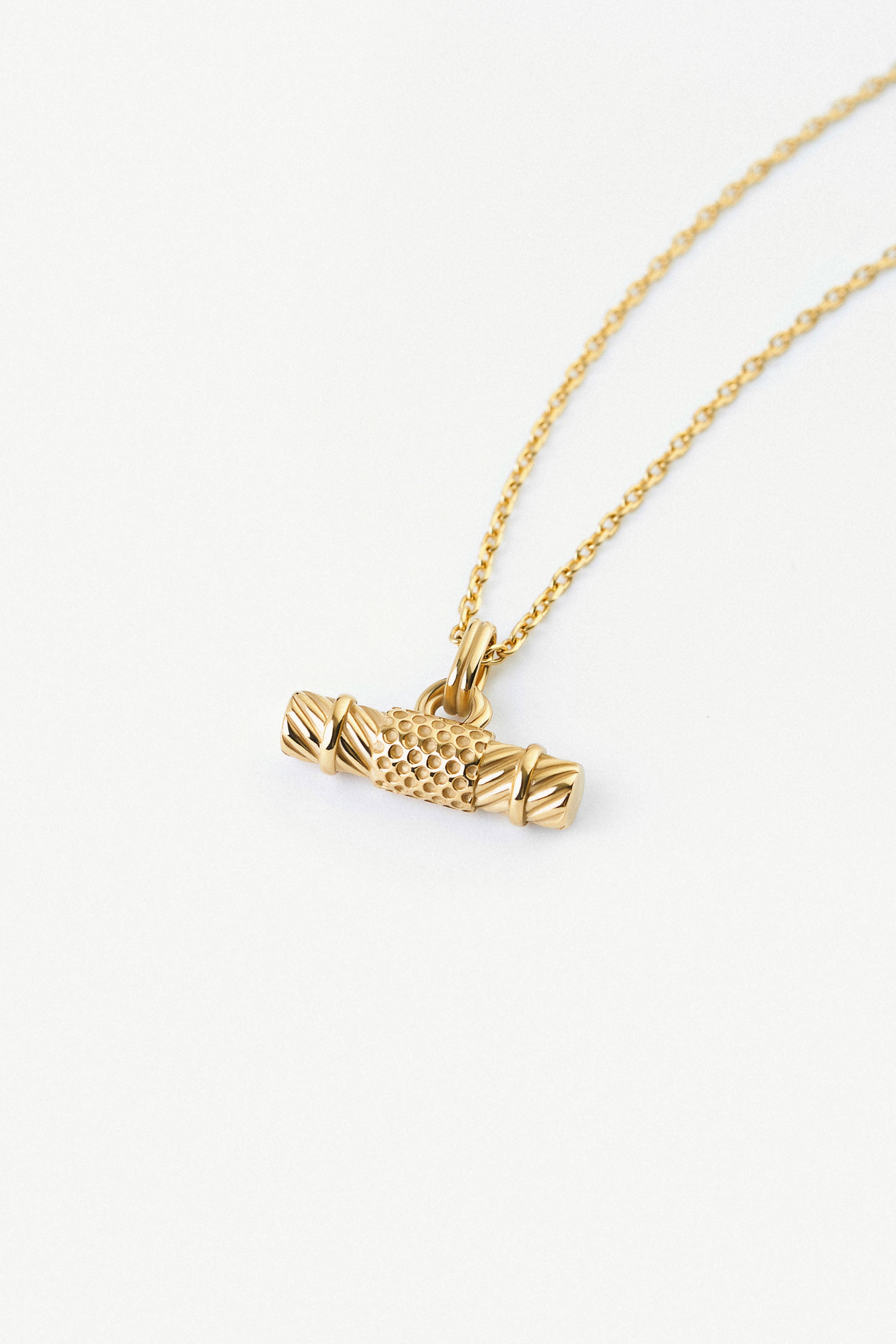 Our Raise The T-Bar Chunky 15K Gold Pendant Necklace is made entirely of 316L stainless steel and then covered with a durable coat of gold using PVD, for a waterproof and high-strength finish. Featuring a textured T-Bar shape design. Measuring approx. 46cm in chain length, with a sliding clasp so you can adjust this to make it tighter, if you wish, and a pendant of approximately 19mm x 5.5mm in width and height.